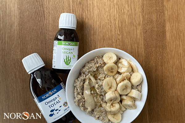 Deite 200 ml de leite ou de bebida de caju num tacho e aqueça. Adicione 50 g de aveia em flocos e deixe ferver, mexendo. Ao mesmo tempo, descasque e corte 2 bananas em rodelas. Aqueça a mistura de leite e aveia até obter a consistência desejada em lume brando, mexendo sempre. Adicione agora 1/2 das rodelas de banana e 1 colher de sopa de manteiga de caju ao tacho e mexa tudo muito bem. Deite a papa numa tigela e decore com a restante metade das rodelas de banana e adicione 1 colher de sopa de manteiga de caju. Misture à papa, agora ligeiramente arrefecida, com 1 colher de sopa de Omega-3 Total ou 1 colher de chá de Omega-3 Vegan.