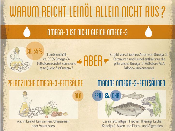 O óleo de linhaça contém mais de 50% de ácido alfa-linolénico (ALA), um ómega-3 de origem vegetal. No entanto, os benefícios para a saúde associados aos ácidos gordos ómega-3 marinhos de cadeia longa, EPA e DHA, são particularmente significativos. Embora o consumo de óleo de linhaça acabado de prensar seja saudável, apenas uma pequena quantidade de ALA é convertida em EPA e DHA pelo organismo. Estudos e medições demonstram que o consumo de óleo de linhaça, por si só, não é suficiente para corrigir uma deficiência de ómega-3 EPA e DHA.